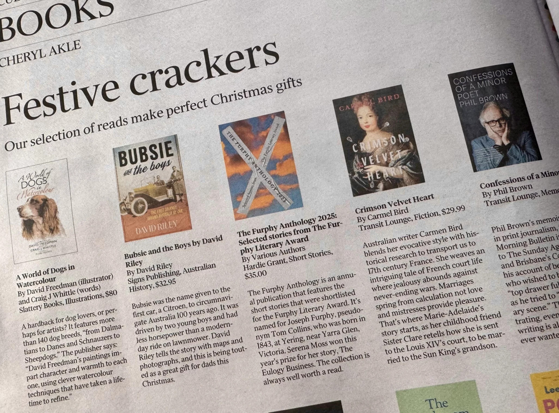 Detsembris lisas avalik-õiguslik ajaleht The Weekend Australian raamatu 20 tähelepanuväärse uue raamatu nimekirja, mis „sobivad ideaalselt jõulukingitusteks”, ajakiri Unique Cars kirjeldas raamatut „Bubsie and the Boys“ kui „kohustuslikku lugemist” ja ajakiri Good Reading andis sellele viie tärni hinnangu.