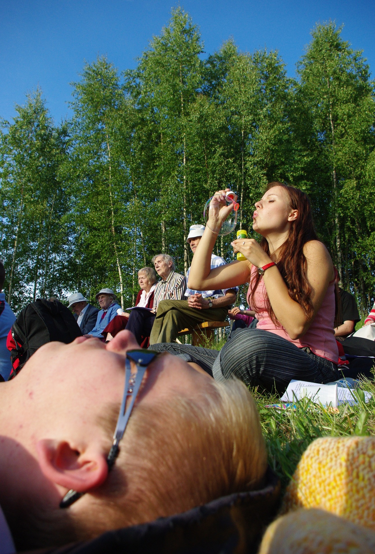Viktoriinile järgnes väike einepaus, kus kõik kaasa võetud toidupoolis sõbralikult ära jagati. Lõpuks, kui kõhud olid täis, meel virge ning selg ja tagumik ära sirutatud, kutsusid eeslauljad kõiki jälle istuma ning alustas laulmist. Kui kõik olid omale koha leidnud ning 3-4 laulu läbi lauldud, sai alguse pastor Rein Kalmuse poolt läbiviidav vestlustund. Nii võime seda vist nimetada, sest ega pastorile palju sõna antudki. Kuna aeg aga oli lennukalt möödunud, siis korralikult lõkke alustamiseks aega enam ei jagunudki. Lõke süüdati sujuvalt vestlustunni ajal. Õhtu lõppes päikese loojangul ühiste lauludega. Kõige lõpus moodustati ühine ring ja loendati kokku 40 koguduse liiget. Pluss üks koer. Tuju oli hea ja õhtu endiselt kaunis.