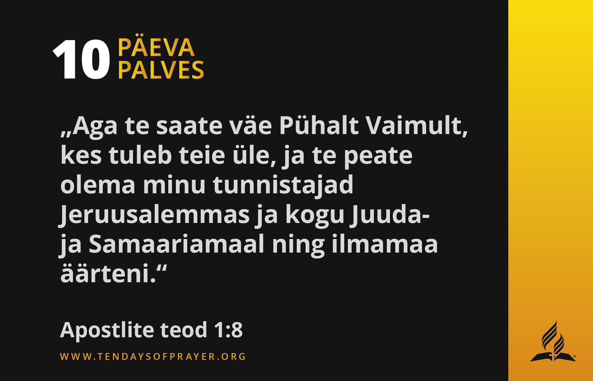 - Risti meid Püha Vaimuga ja anna meile väge, et kuulutaksime evangeeliumit pimeduses olevale maailmale (Ap 1:5–8).