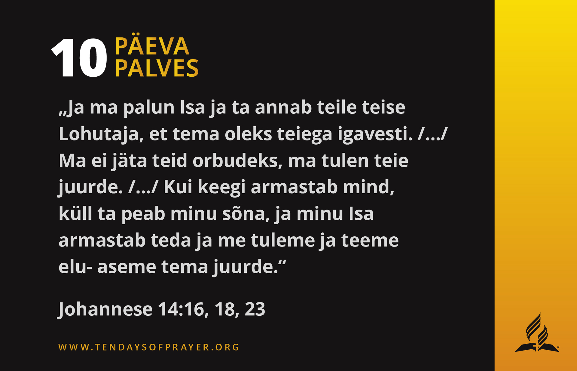 - Palvetame oma laste eest. Anna neile jõudu seista kindlalt Sinu poolel, kui nende teele tulevad takistused ja surve. Aita neil langetada tarku otsuseid ja seista tõe eest (Js 44:3, 4).