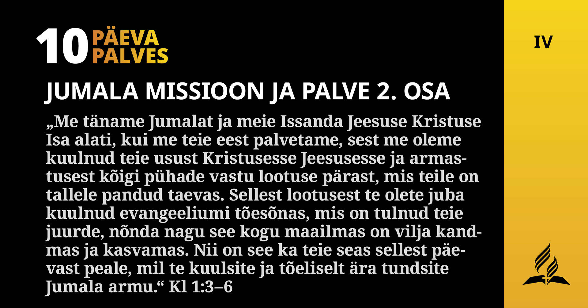 „Me täname Jumalat ja meie Issanda Jeesuse Kristuse Isa alati, kui me teie eest palvetame, sest me oleme kuulnud teie usust Kristusesse Jeesusesse ja armastusest kõigi pühade vastu lootuse pärast, mis teile on tallele pandud taevas. Sellest lootusest te olete juba kuulnud evangeeliumi tõesõnas, mis on tulnud teie juurde, nõnda nagu see kogu maailmas on vilja kandmas ja kasvamas. Nii on see ka teie seas sellest päevast peale, mil te kuulsite ja tõeliselt ära tundsite Jumala armu.“ Kl 1:3–6