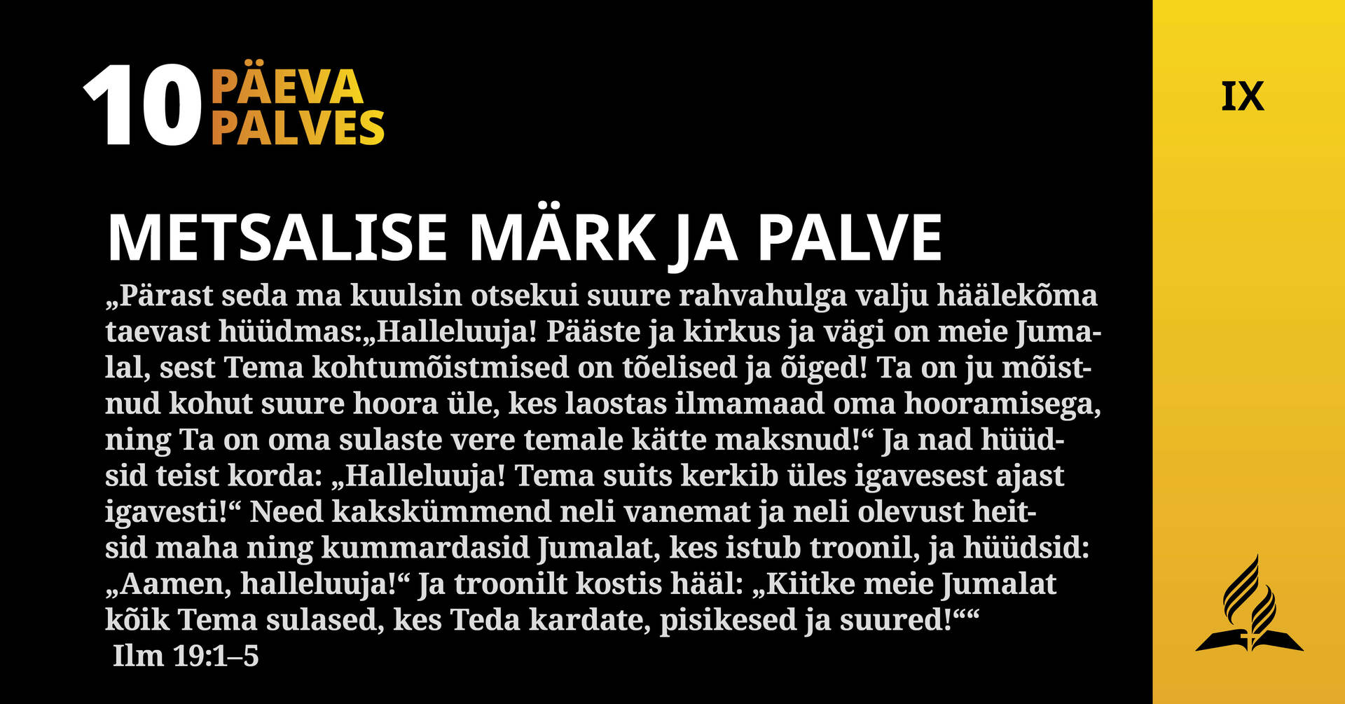 „Pärast seda ma kuulsin otsekui suure rahvahulga valju häälekõma taevast hüüdmas:„Halleluuja! Pääste ja kirkus ja vägi on meie Jumalal, sest Tema kohtumõistmised on tõelised ja õiged! Ta on ju mõistnud kohut suure hoora üle, kes laostas ilmamaad oma hooramisega, ning Ta on oma sulaste vere temale kätte maksnud!“ Ja nad hüüdsid teist korda: „Halleluuja! Tema suits kerkib üles igavesest ajast igavesti!“ Need kakskümmend neli vanemat ja neli olevust heitsid maha ning kummardasid Jumalat, kes istub troonil, ja hüüdsid: „Aamen, halleluuja!“ Ja troonilt kostis hääl: „Kiitke meie Jumalat kõik Tema sulased, kes Teda kardate, pisikesed ja suured!““ Ilm 19:1–5