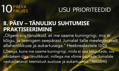 Tänu ja kiitus: Tänage konkreetsete õnnistuste eest ja kiitke Jumalat Tema headuse eest.