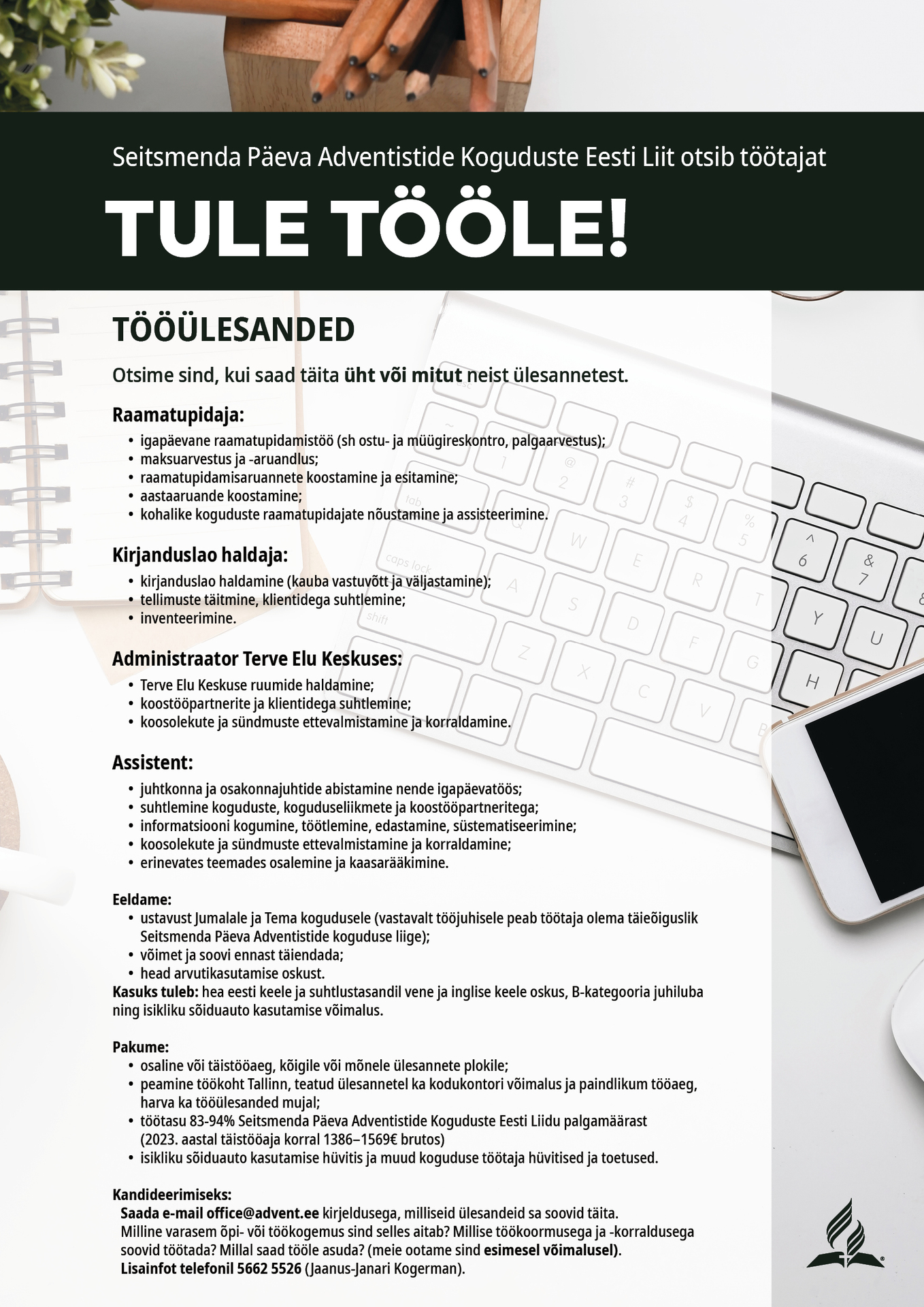 - töötasu 83-94% Seitsmenda Päeva Adventistide Koguduste Eesti Liidu palgamäärast